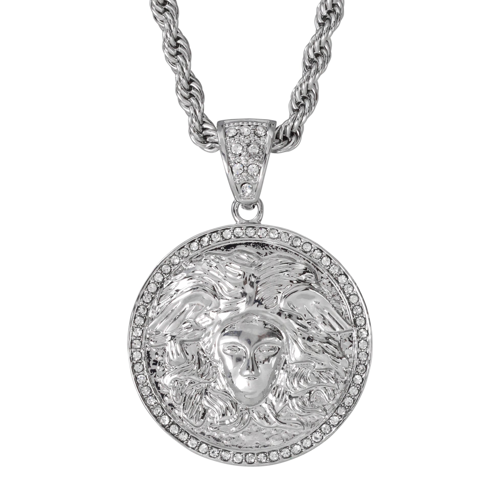 Our Iced Out Large Pendant Series is available in gold and silver plated alloy. These pendants come with a 8mm Solid Rope Chain measuring 24" in length and feature simulated crystals that resemble the sparkle of real diamonds.