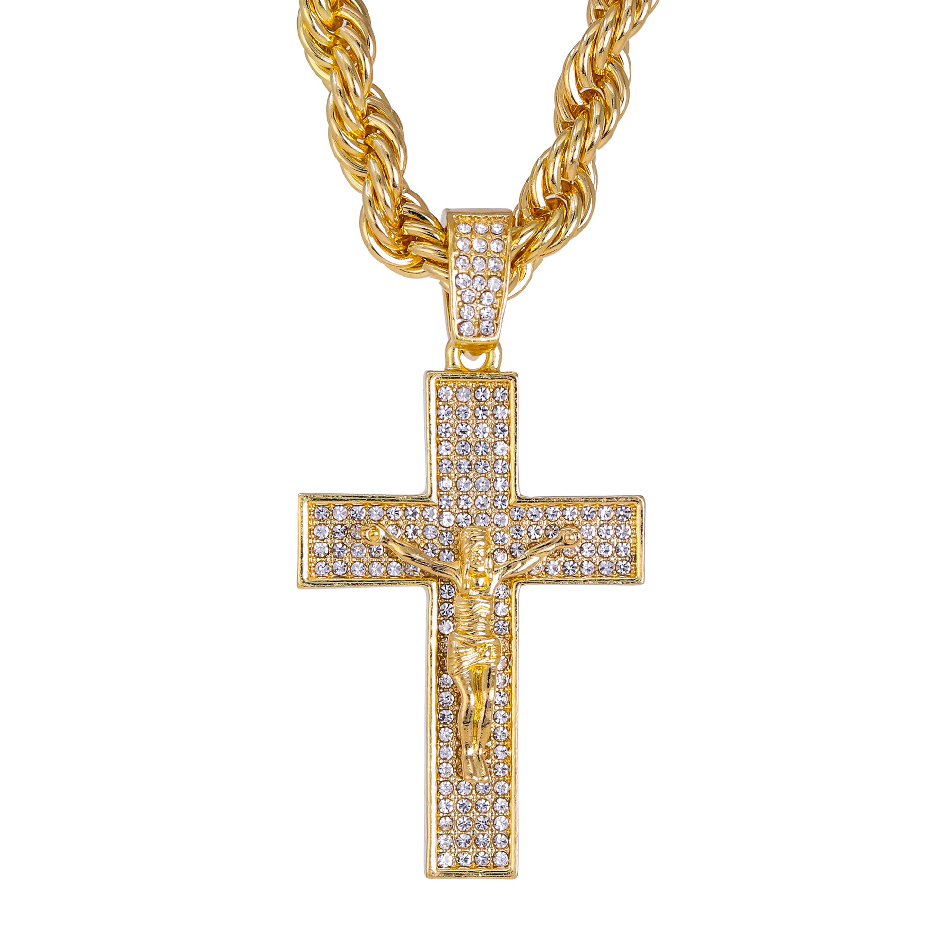 Our Iced Out Large Pendant Series is available in gold and silver plated alloy. These pendants come with a 8mm Solid Rope Chain measuring 24" in length and feature simulated crystals that resemble the sparkle of real diamonds.