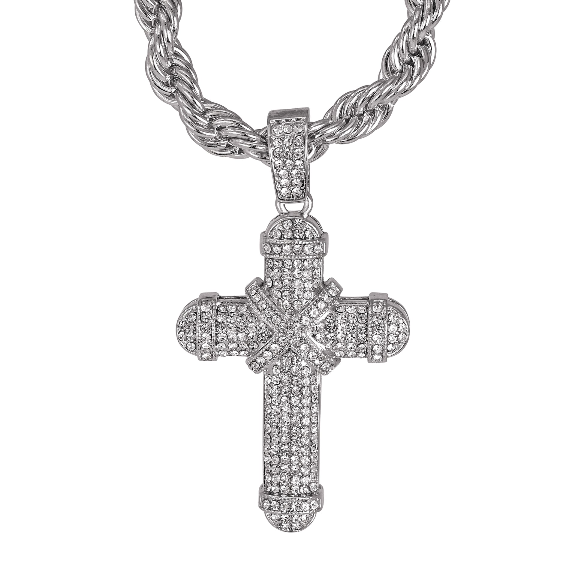 Our Iced Out Large Pendant Series is available in gold and silver plated alloy. These pendants come with a 8mm Solid Rope Chain measuring 24" in length and feature simulated crystals that resemble the sparkle of real diamonds.