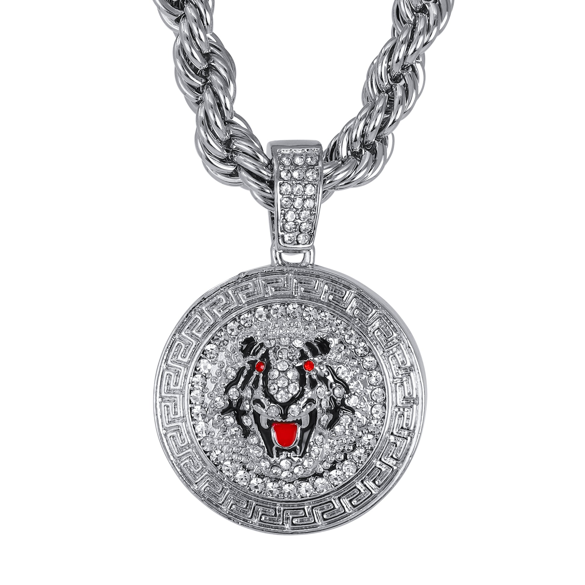 Our Iced Out Large Pendant Series is available in gold and silver plated alloy. These pendants come with a 8mm Solid Rope Chain measuring 24" in length and feature simulated crystals that resemble the sparkle of real diamonds.