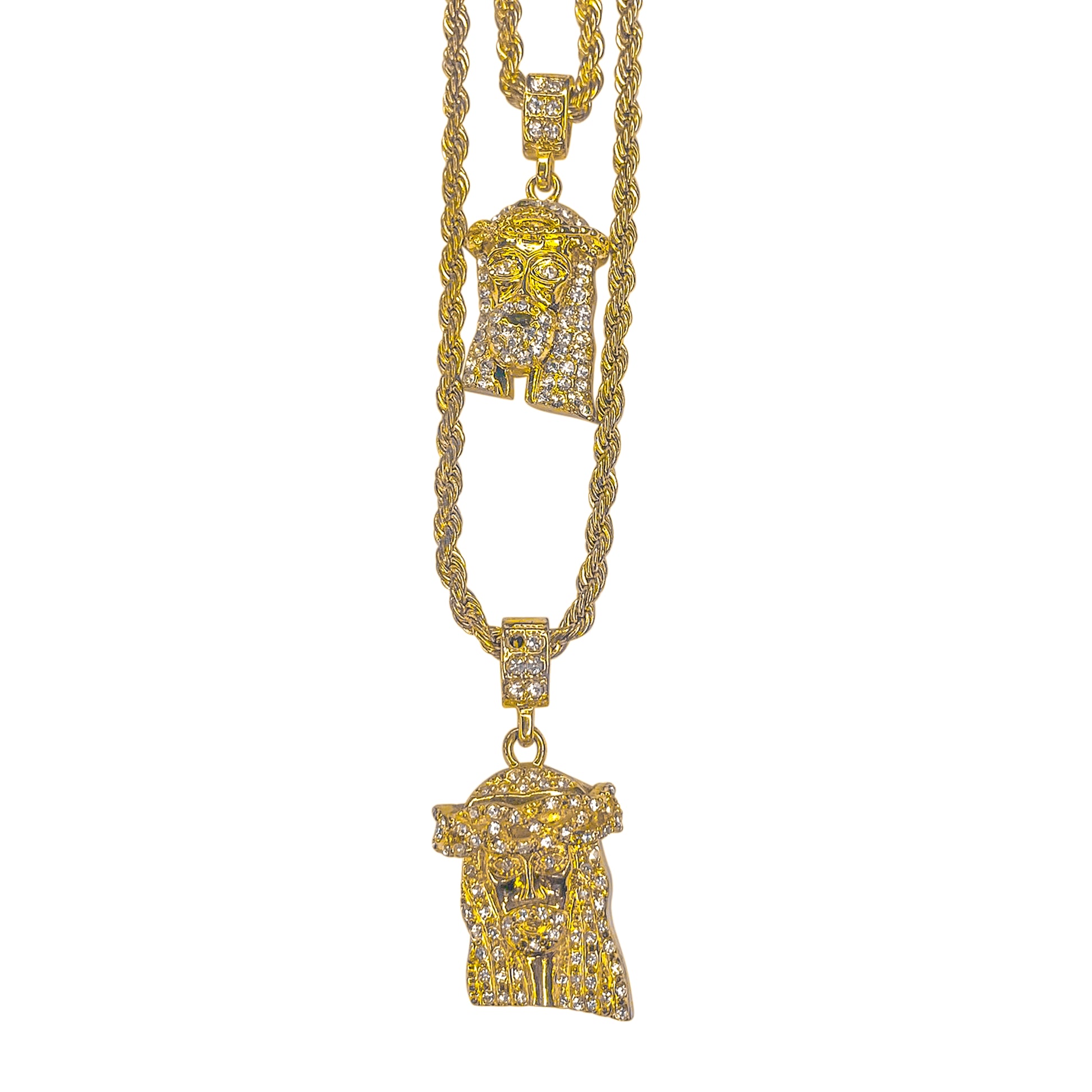 Our Iced Out Stackable Pendant Series is available in gold and silver plated alloy. These pendants come with two Rope Chains, measuring 24" and 30" length. With a compact 1-2 inch size pendants, this collection offers a stylish choice.