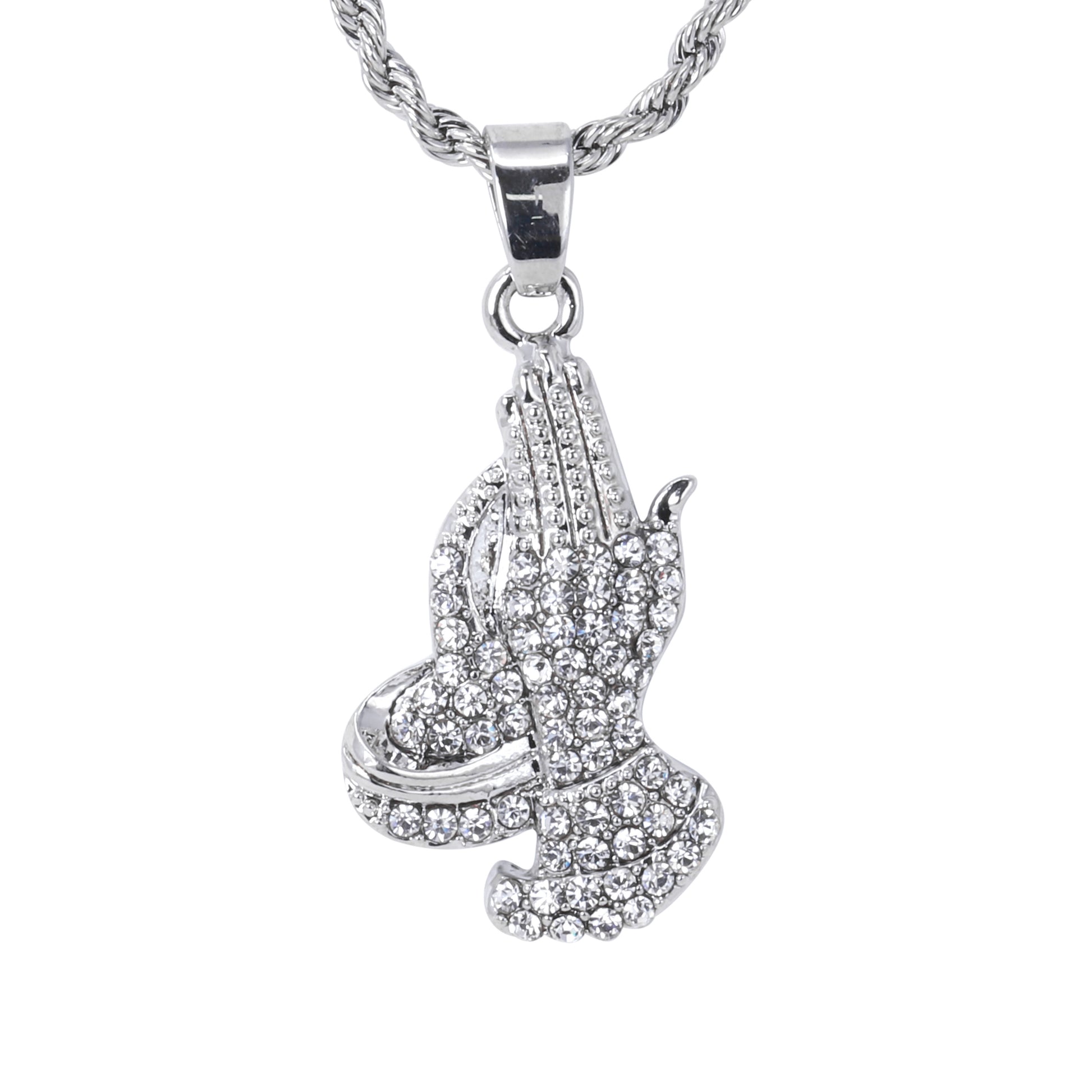 Iced Mini Praying Hands Pendant with 3mm Rope Chain 24" - HC-392