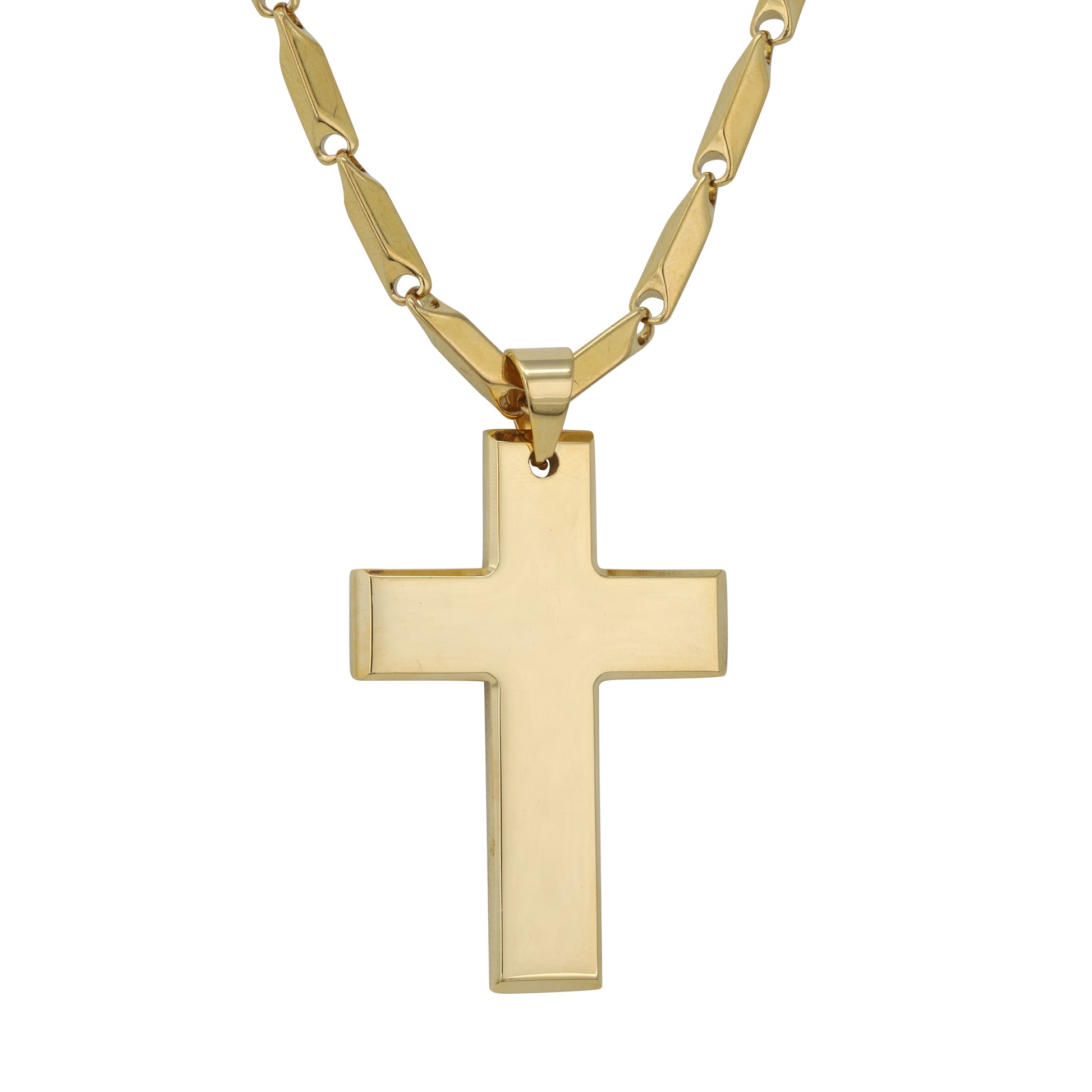 Our Stainless Steel Large Pendant Series is available in gold and silver plated finish. These pendants come with a 4mm Bullet Chain measuring 24" length. With a 3-inch pendant size, this collection offers a stylish choice.