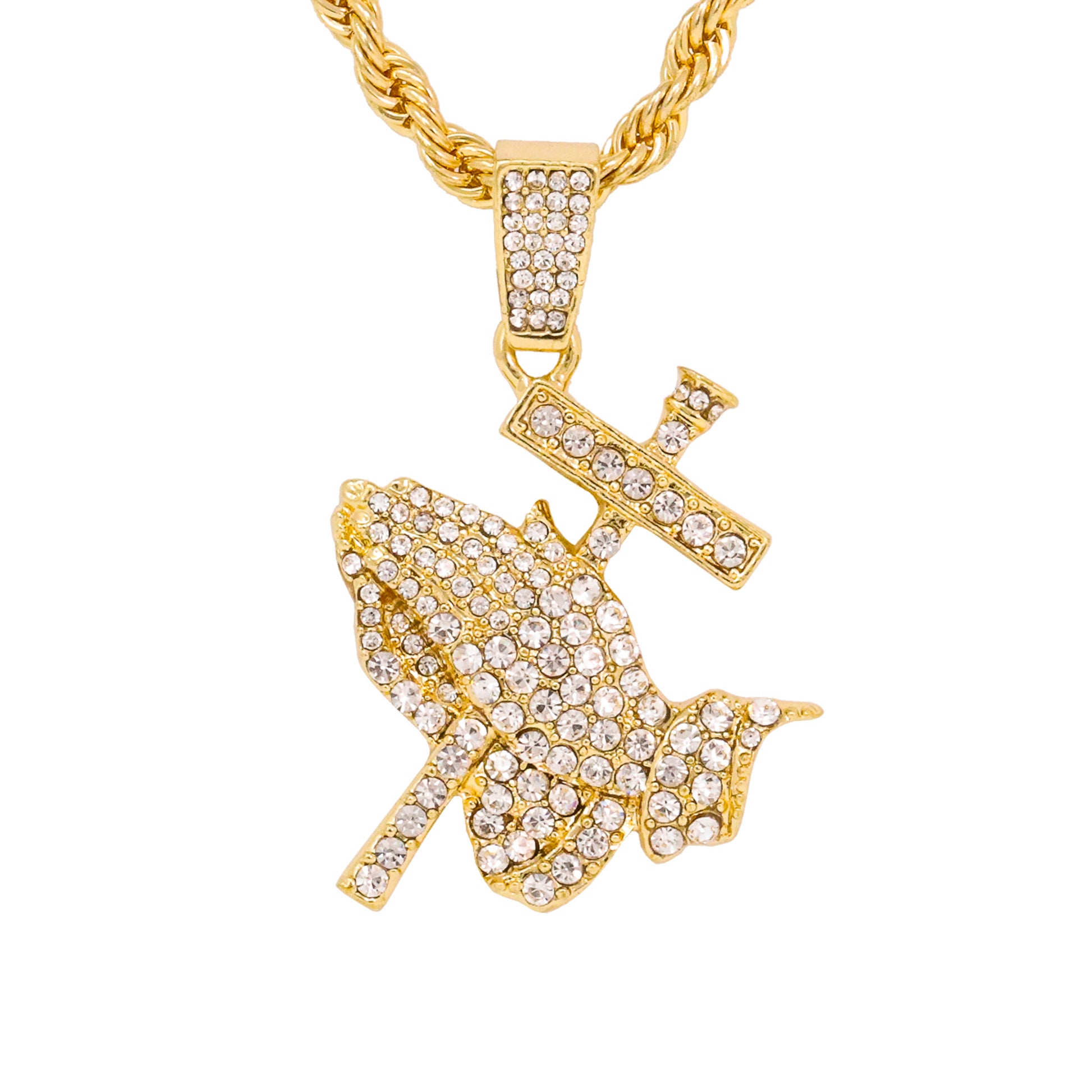 Iced Medium Praying Hands Pendant with 4mm Rope Chain 24" - HC-1221