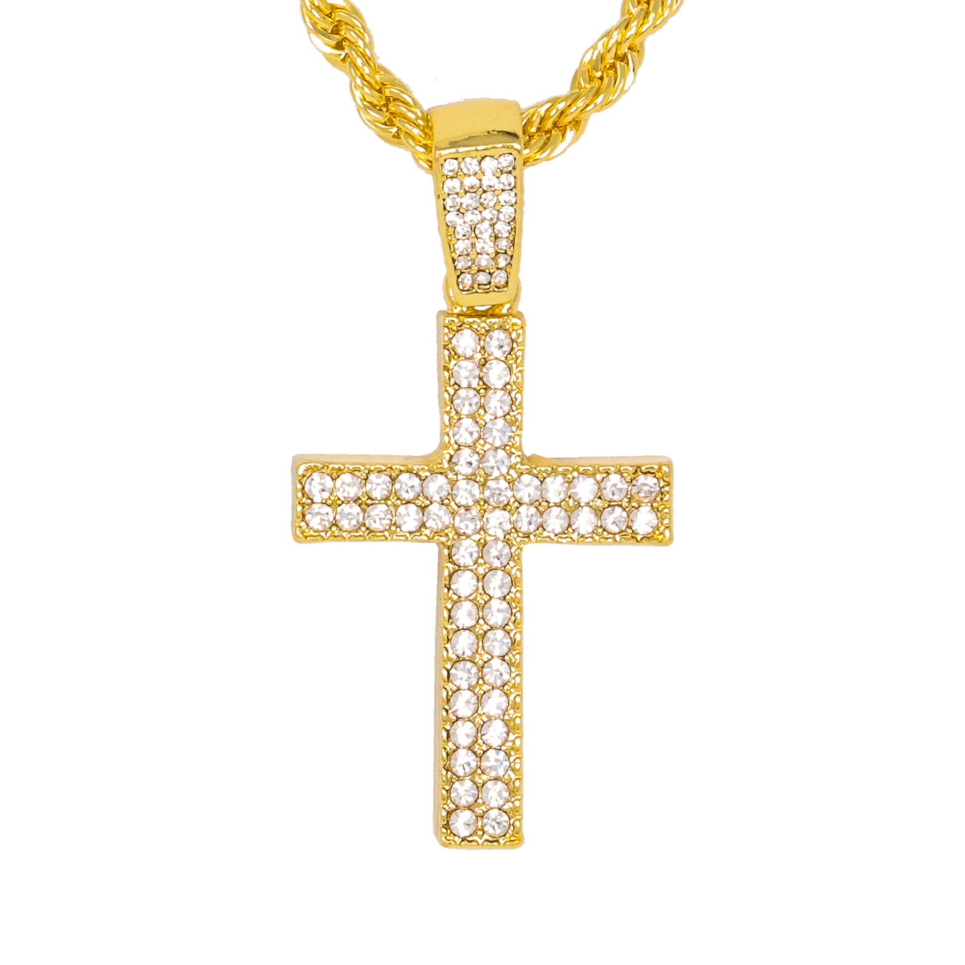 Our Iced Out Medium Pendant Series is available in gold and silver plated alloy. These pendants come with a 4mm Solid Rope Chain measuring 24" in length and feature simulated crystals that resemble the sparkle of real diamonds.