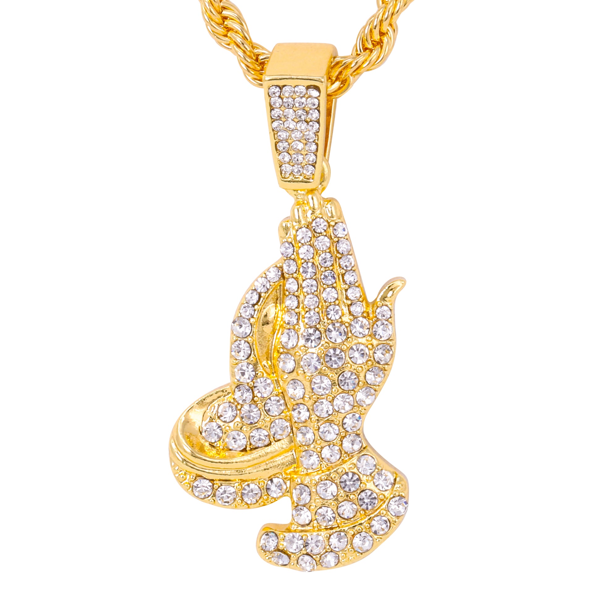 Iced Medium Praying Hands Pendant with 4mm Rope Chain 24" - HC-1388