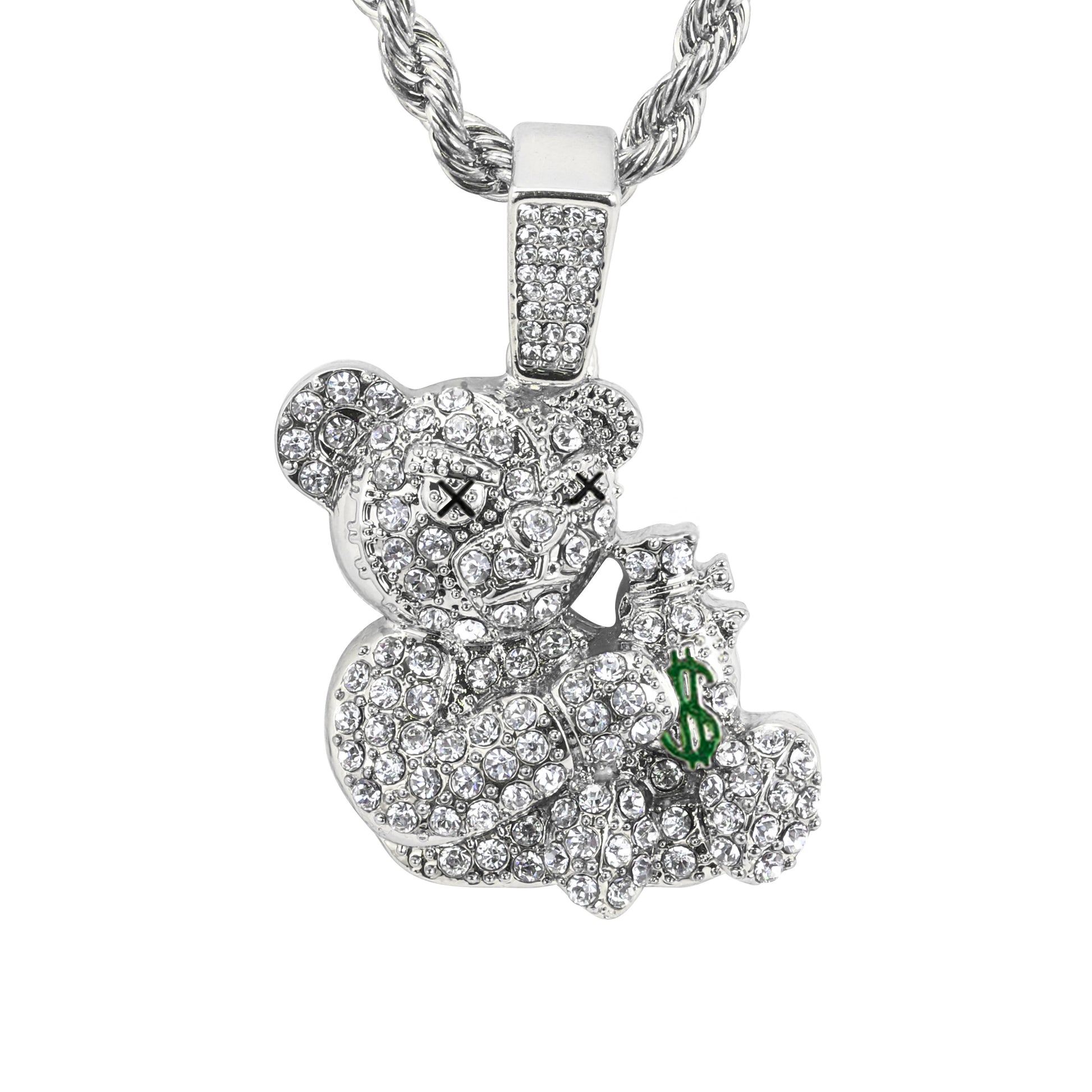 Our Iced Out Medium Pendant Series is available in gold and silver plated alloy. These pendants come with a 4mm Solid Rope Chain measuring 24" in length and feature simulated crystals that resemble the sparkle of real diamonds.